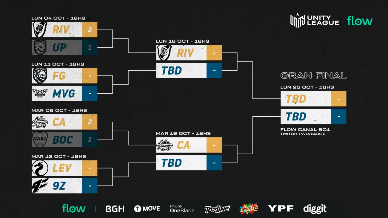 La Unity League Flow organizada por la Liga de Videojuegos Profesional (LVP) Grupo MEDIAPRO y Flow, tiene definidos a los primeros semifinalistas tras las victorias de River Plate Gaming y Coscu Army Esports. Los próximos lunes 11 y martes 12 de octubre se disputarán los otros dos enfrentamientos de Cuartos de Final, para conocer los rivales del millonario y la CA, a partir de las 18hs (ARG) por Flow Gaming XP (canal 601 Flow) y los canales oficiales de LVP Argentina en Twitch y YouTube.
