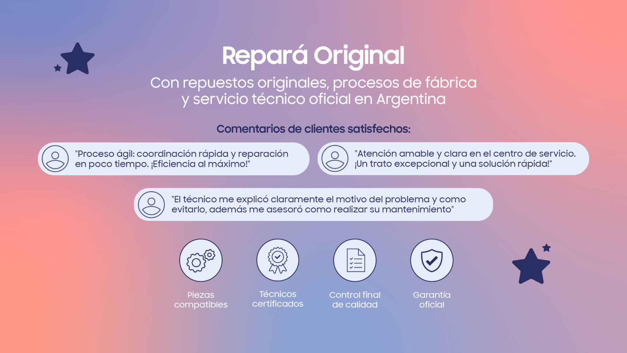 La campaña “Repará Original” promueve la reparación de productos exclusivamente en los Centros de Servicio oficiales, donde se utilizan piezas nuevas y originales, técnicos certificados, procesos alineados a los estándares globales de fábrica y control de calidad postservicio. Además, se ofrece una garantía oficial por 60 días. Actualmente, la red cuenta con más de 135 centros disponibles en todo el país.