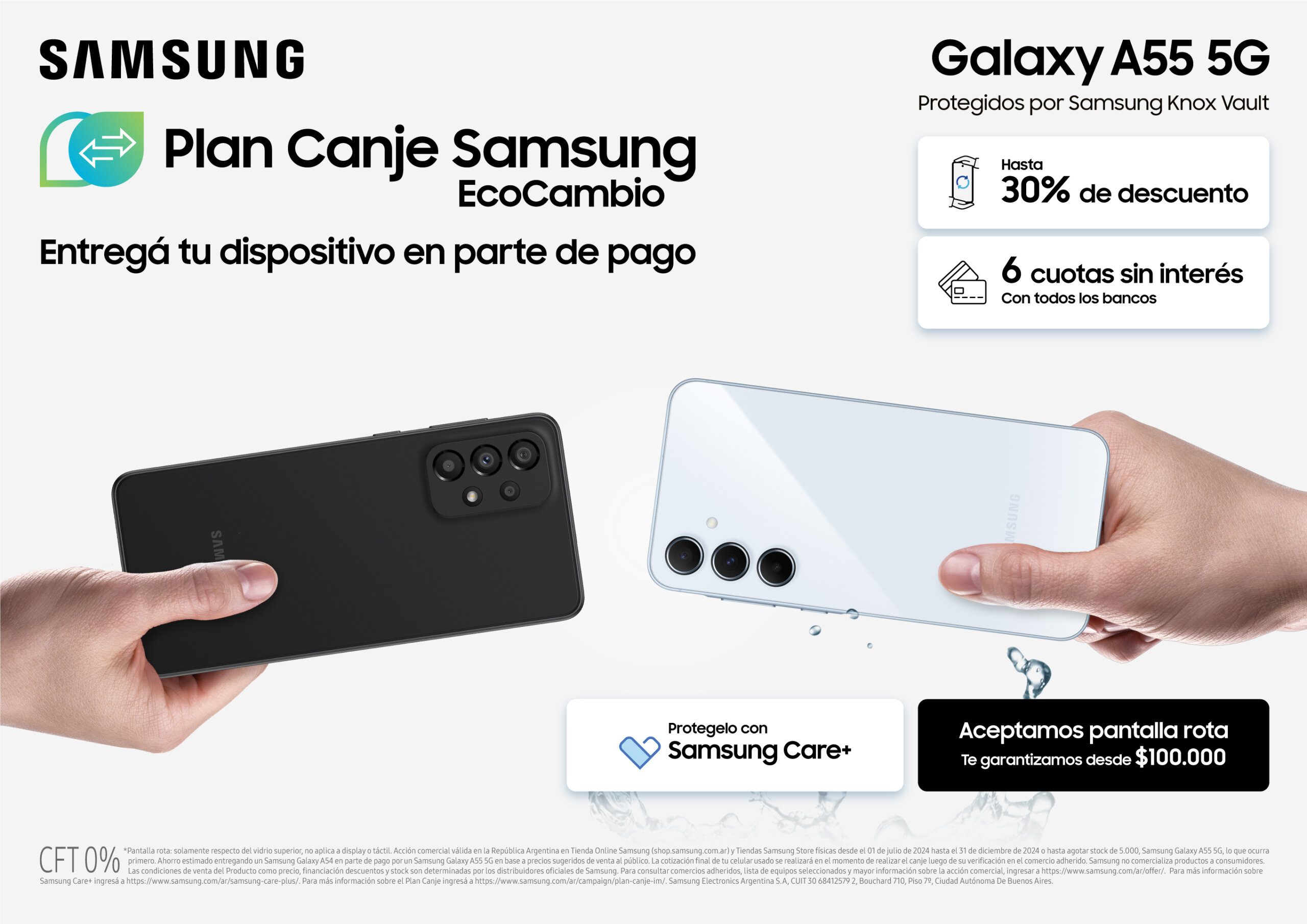 - Plan Canje Garantizado: Con el Plan Canje, es posible entregar hasta dos dispositivos (celulares y/o tablets), incluso con la pantalla rota, para obtener hasta un 30% de descuento en los nuevos Galaxy A35 5G y Galaxy A55 5G. Samsung también ofrece un reintegro de desde $100.000.