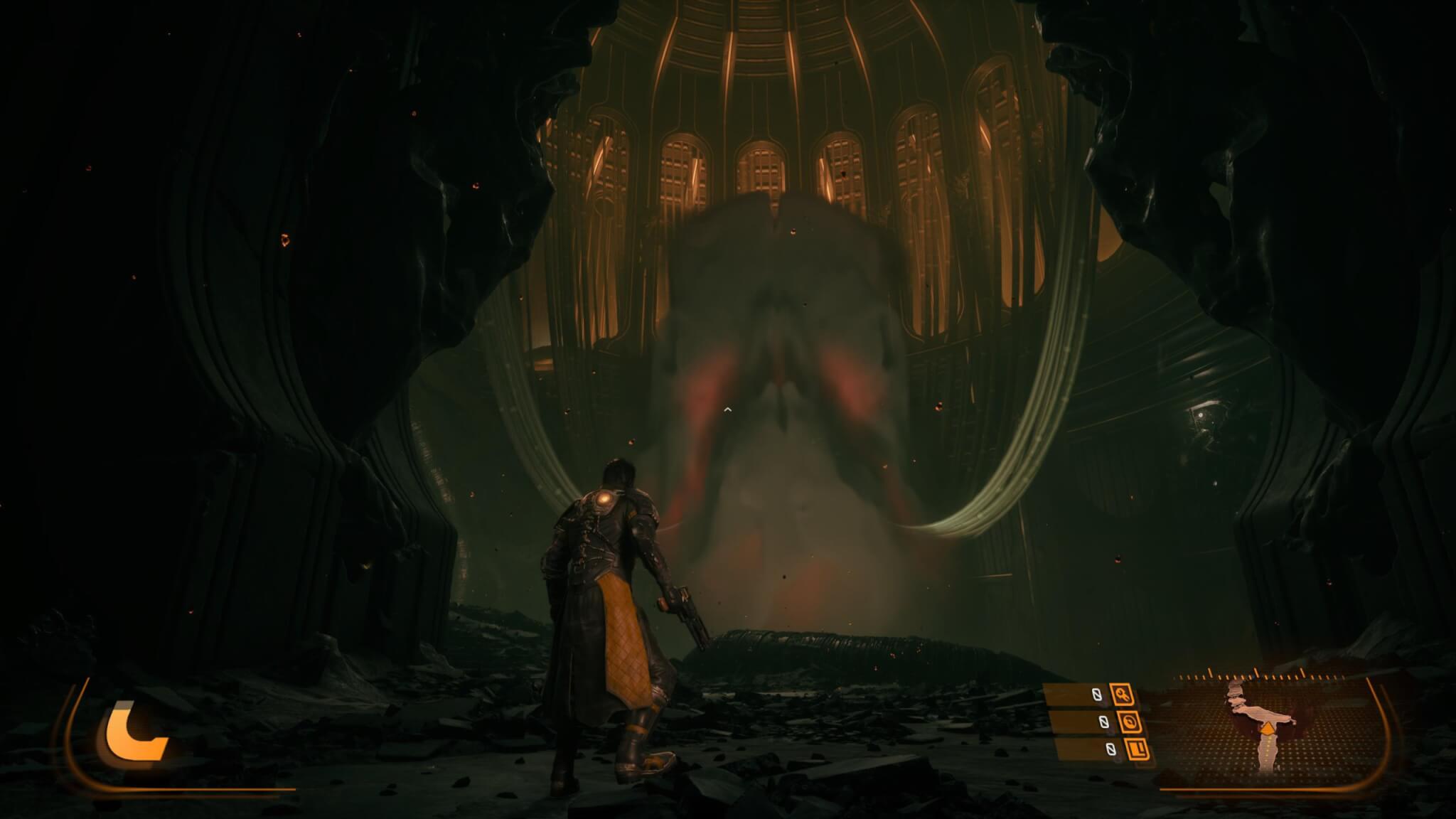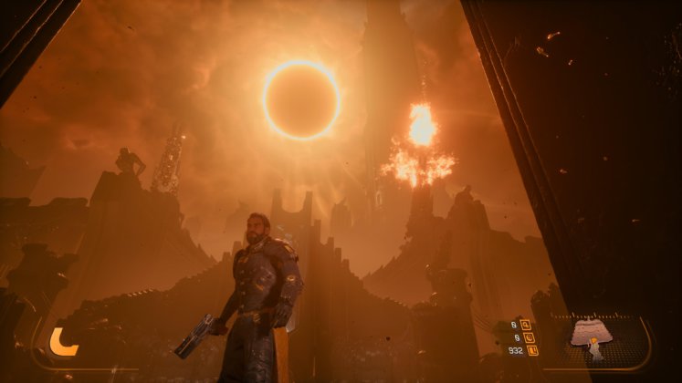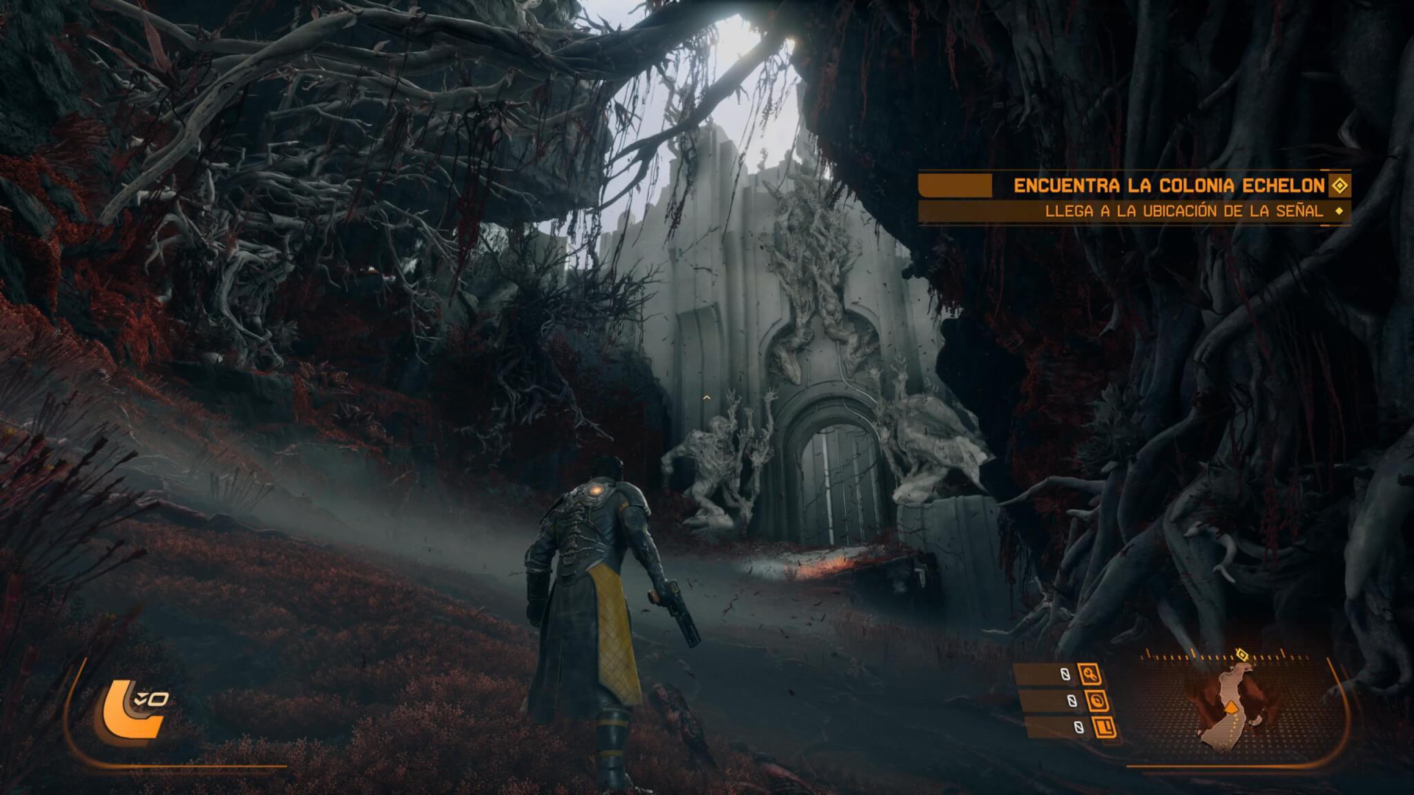 El planeta Carcosa también aporta muchísimo a la experiencia. No es un simple escenario, sino un entorno vivo que cambia con cada partida. Hay ruinas tecnológicas, zonas donde lo orgánico parece haber tomado el control y regiones completamente alteradas por la influencia del eclipse. Lo interesante es cómo estos biomas no solo cambian visualmente, sino también en lo jugable, abriendo caminos distintos o revelando áreas nuevas según la run. Esto no solo mejora la rejugabilidad, sino que mantiene constante la sensación de descubrimiento.