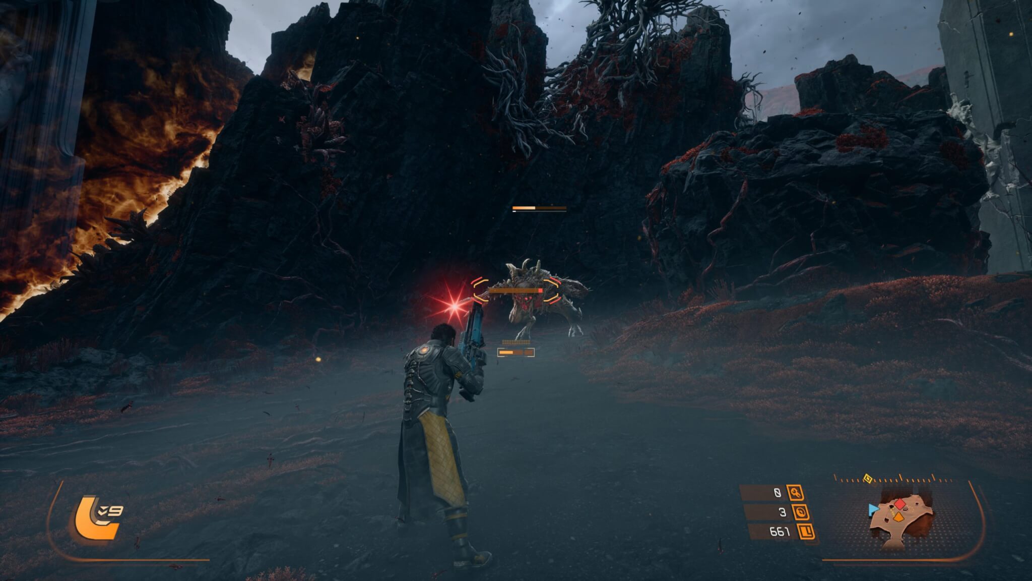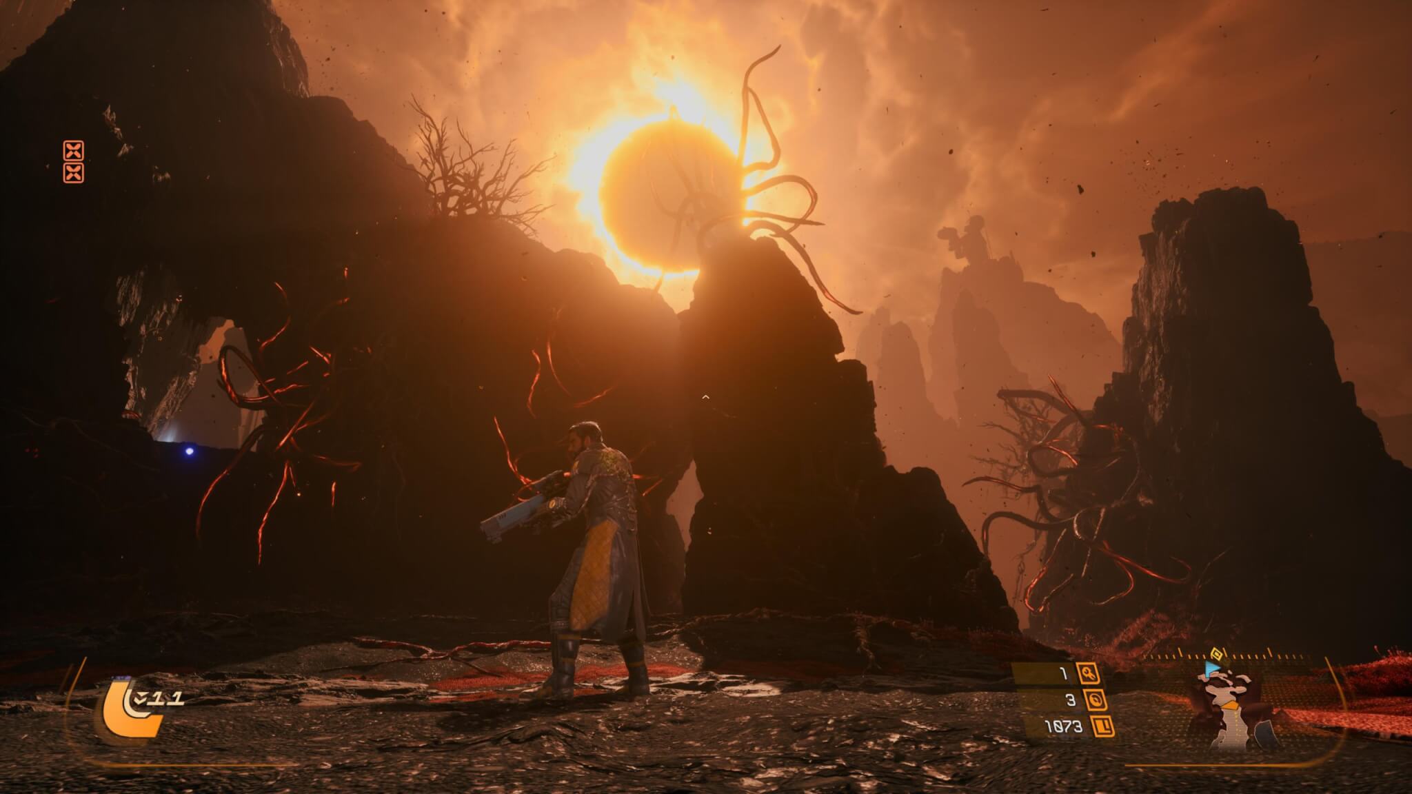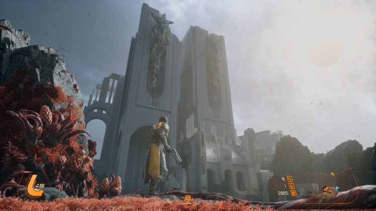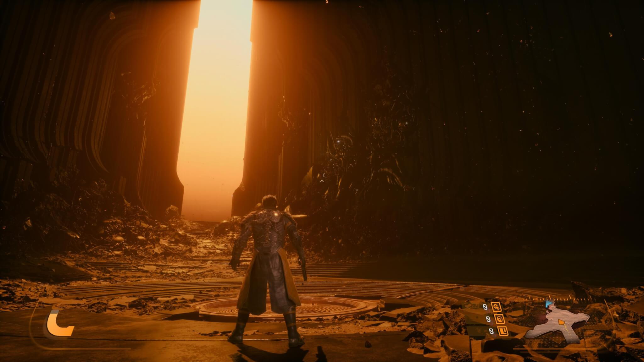 El planeta Carcosa también aporta muchísimo a la experiencia. No es un simple escenario, sino un entorno vivo que cambia con cada partida. Hay ruinas tecnológicas, zonas donde lo orgánico parece haber tomado el control y regiones completamente alteradas por la influencia del eclipse. Lo interesante es cómo estos biomas no solo cambian visualmente, sino también en lo jugable, abriendo caminos distintos o revelando áreas nuevas según la run. Esto no solo mejora la rejugabilidad, sino que mantiene constante la sensación de descubrimiento.
