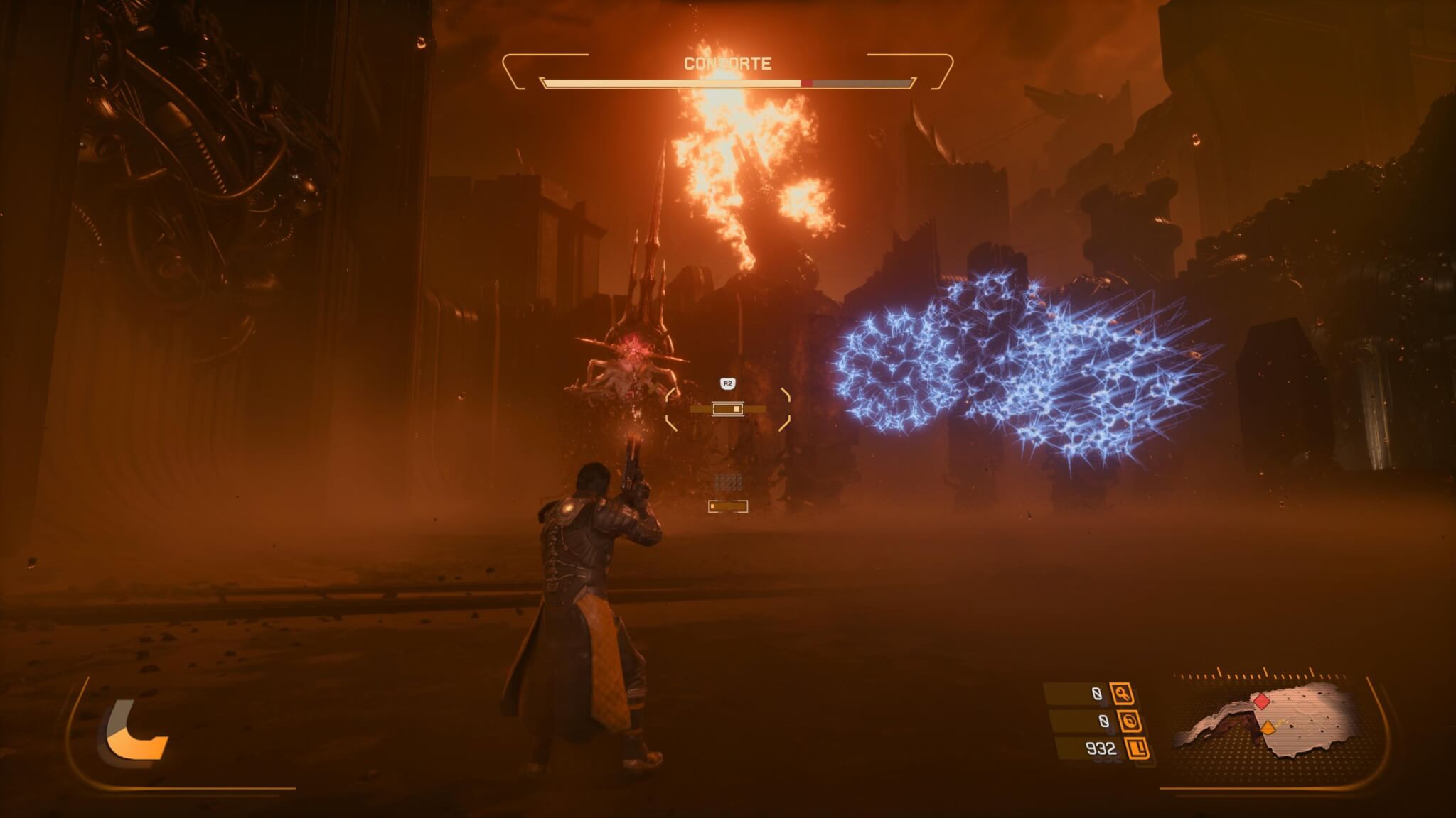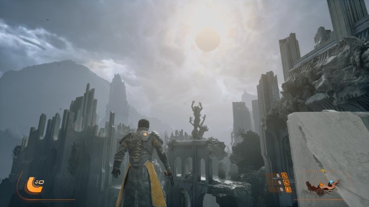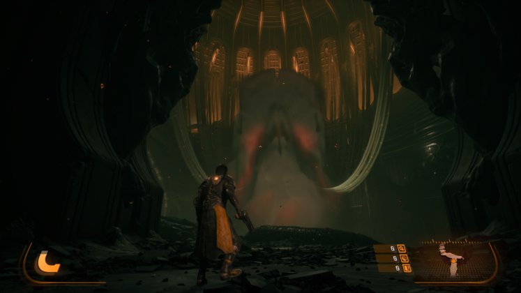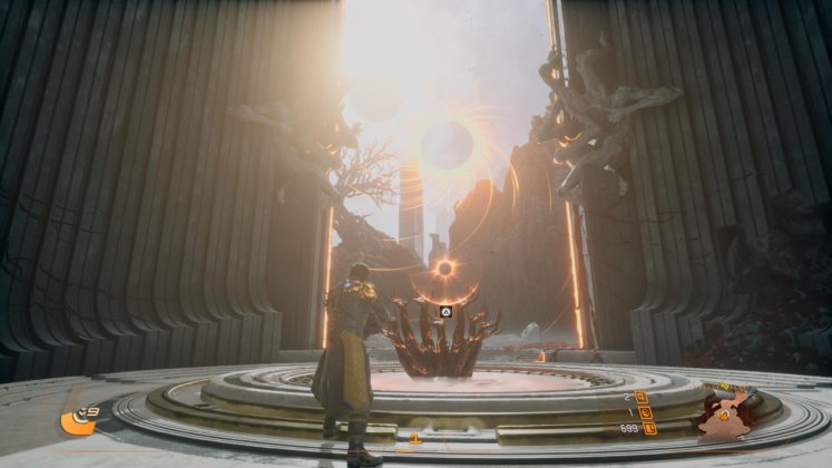 En lo técnico, Saros es un espectáculo. El nivel de detalle es altísimo, con efectos de partículas que llenan la pantalla sin comprometer la claridad del combate. La iluminación, dominada por ese eclipse omnipresente, le da una identidad visual muy fuerte, con contrastes marcados y una atmósfera opresiva. Todo se mueve con fluidez, algo fundamental para un juego que exige tanta precisión, y cada enfrentamiento se siente tan caótico como controlado. Los tiempos de carga son absurdamente cortos, y podemos estar jugando a los pocos segundos de encender nuestra consola o bien automáticamente una vez derrotados.