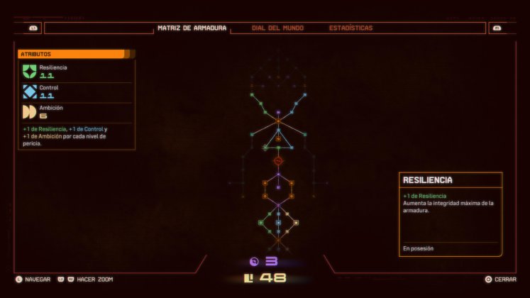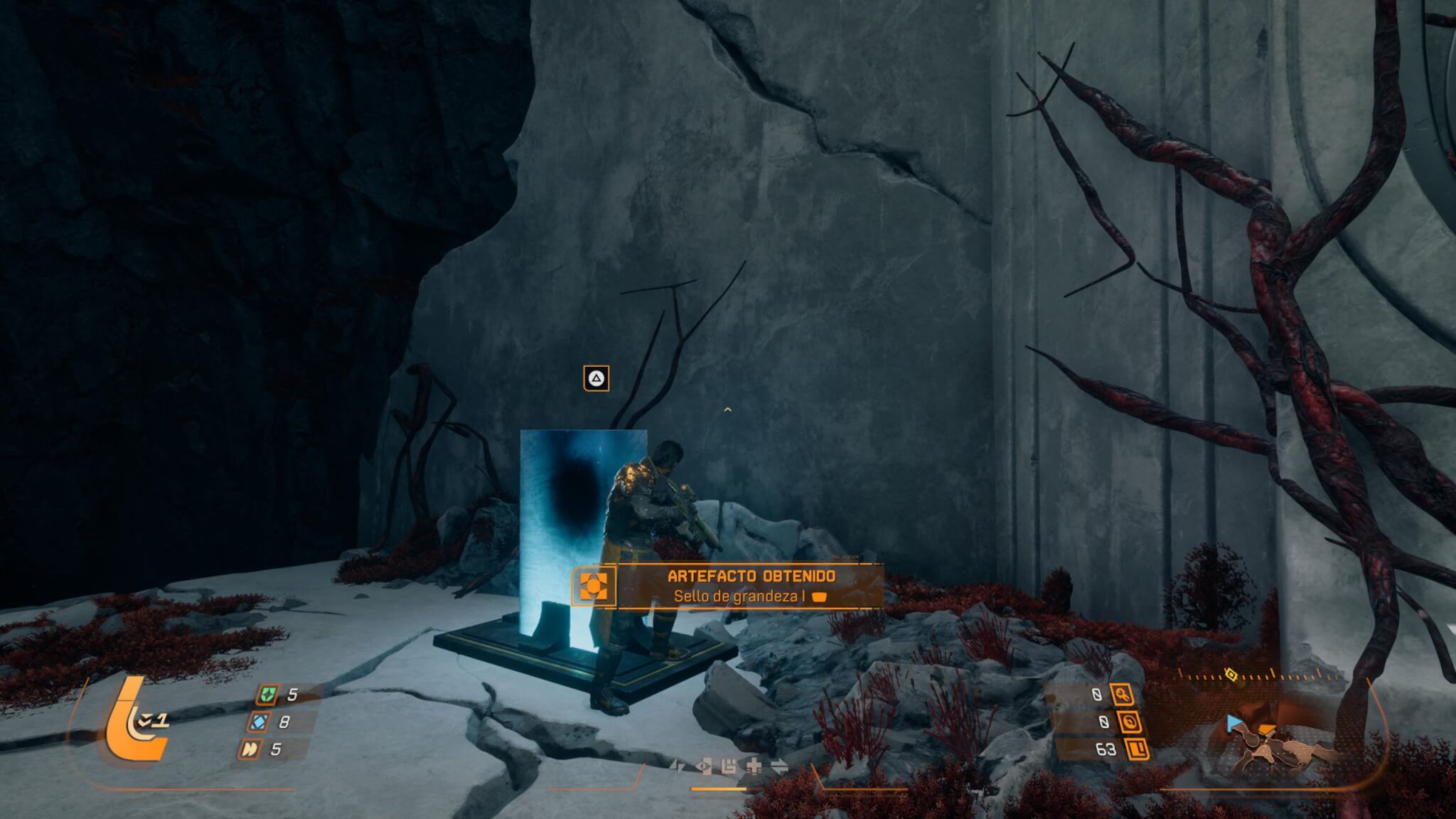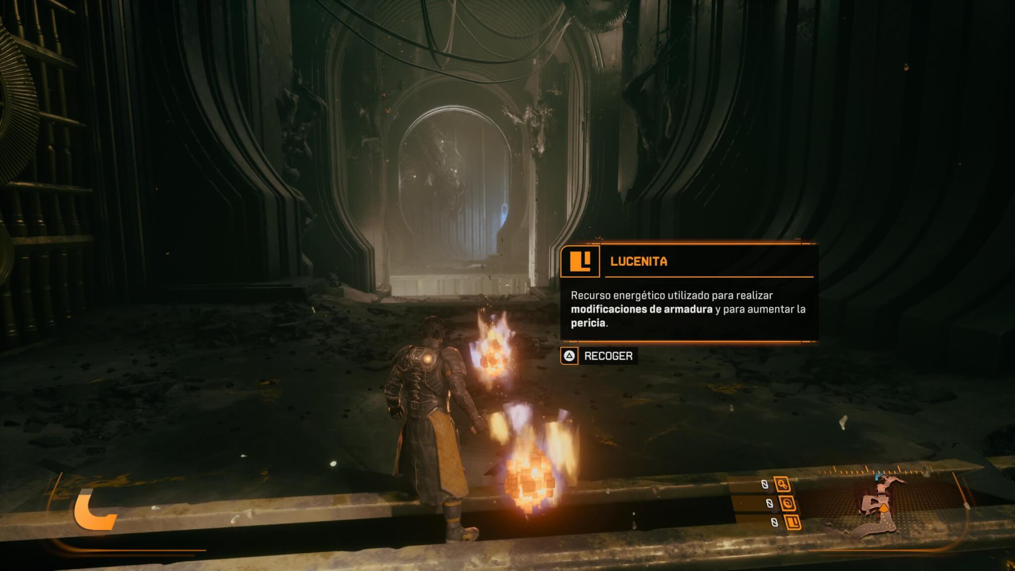 A diferencia de lo que sucedió en Returnal, Saros es más amigable para los jugadores en cuanto a beneficios y mejoras de personaje. Cada partida tiene una duración promedio de 30 minutos aproximadamente (por ahí un poco más, dependiendo lo diestros que seamos con los controles), y puede finalizar por dos motivos: morimos (lo más probable) o Arjun cumplió con su objetivo y volvimos a la base. Cualquiera sea el caso, podremos adquirir mejoras para nuestro protagonista que irán haciendo que las partidas sean mucho más entretenidas. Para esto deberemos juntar el recurso más valioso encontrado por el hombre: lucenita y alcion. La lucenita (como te lo recuerdan en incontables oportunidades es “propiedad de Soltari”, como todo recurso del planeta) es la más común y más sencilla de conseguir ya que no sólo está suelta por todo el mapa en pequeñas cantidades sino que además al derrotar enemigos también podremos obtenerla. En cambio, el alcion es más difícil y para eso deberemos explorar. Este compuesto nos servirá para desbloquear mejoras específicas en el árbol de habilidades, pero también podremos canjearlo en alguno de los monolitos que rompemos para restablecer la mejora que estos nos ofrecen en caso que no estemos seguros de querer cambiar nuestro equipo por el que nos ofrecen.