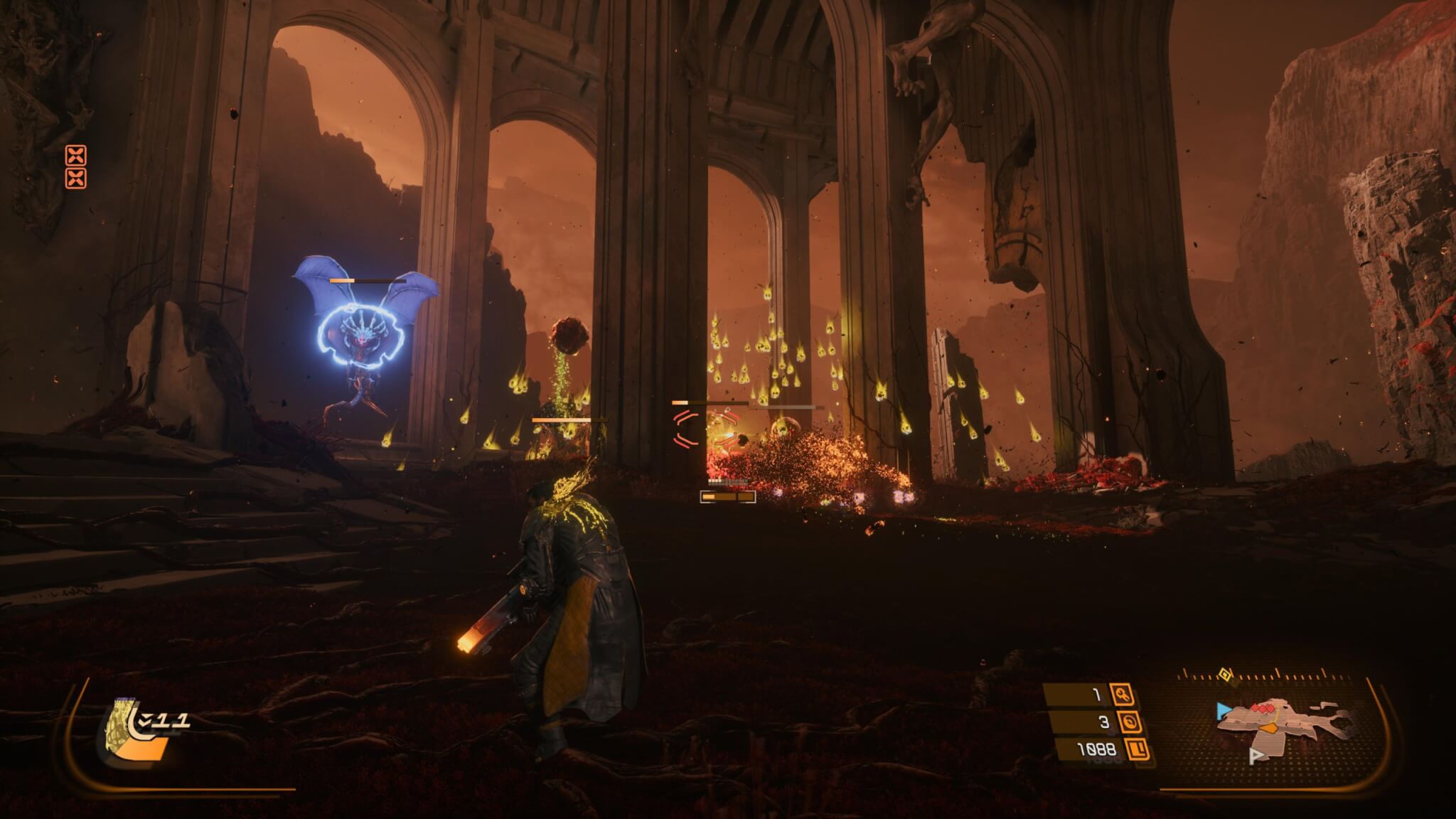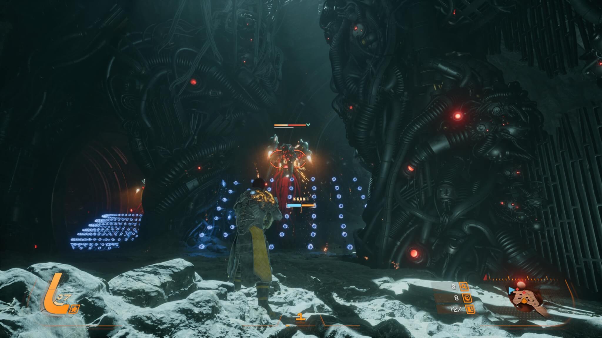 Los enemigos juegan un rol central en cómo se construye esa tensión. No son simples obstáculos, sino piezas diseñadas para obligarte a adaptarte constantemente. Hay criaturas alienígenas deformadas por el eclipse, máquinas con ataques extremadamente precisos y jefes que elevan la exigencia al máximo con múltiples fases y patrones complejos. Cada tipo de enemigo tiene su lógica, y entenderla es clave para sobrevivir. En muchos casos, la pantalla se llena de proyectiles, pero nunca se siente injusto: siempre hay una forma de salir, siempre que tengas la habilidad para leer la situación. Como en los juegos de este estilo, tendremos enemigos comunes, seguidos de algunos jefes intermedios para llegar, indefectiblemente, al jefe final que nos dará más de un dolor de cabeza pero que, siempre, podremos encontrar la forma de vencerlo.