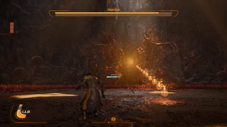 En este apartado es donde además se ve un gran tabajo con el Dualsense, sobre todo con los gatillos adaptativos. Cada arma que utilizamos se siente completamente diferente una de otra. Con R2 dispararemos, pero dependiendo la presión que realicemos sobre el botón L2 tendremos 3 modos de disparo distintos: presionando levemente L2 podremos ampliar la mira de nuestra arma; con presión media, cargaremos el arma para que al disparar largue un ataque más potente; con presión total, dejaremos el arma de lado para utilizar un ataque especial pesado que permitirá hacer una gran cantidad de daño a nuestros enemigos. Igualmente, para lograr este ataque, Arjun deberá utilizar su escudo (R1) para absorber los disparos azules (consejo: el resto esquívenlos) y así cargar a tope esta habilidad, logrando así una interesante combinación entre ataque y defensa que al principio costará pero una vez nos adaptemos será uno de nuestros movimientos favoritos.