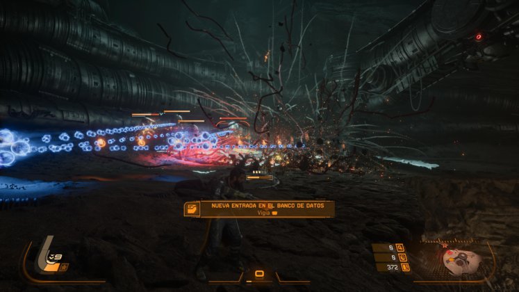En lo jugable es donde Saros realmente brilla. El estudio vuelve a apoyarse en su ADN de acción tipo “bullet hell”, pero ahora con una sensación de control mucho más pulida. Todo gira en torno al movimiento constante: esquivar en el momento justo, posicionarse bien y aprovechar cada ventana de ataque. Las armas tienen habilidades que se pueden combinar, lo que suma una capa estratégica interesante, mientras que los escudos no son solo defensa, sino también una herramienta activa dentro del combate. Cada enfrentamiento se siente como una coreografía en la que el error se paga caro, pero también donde el aprendizaje es constante.