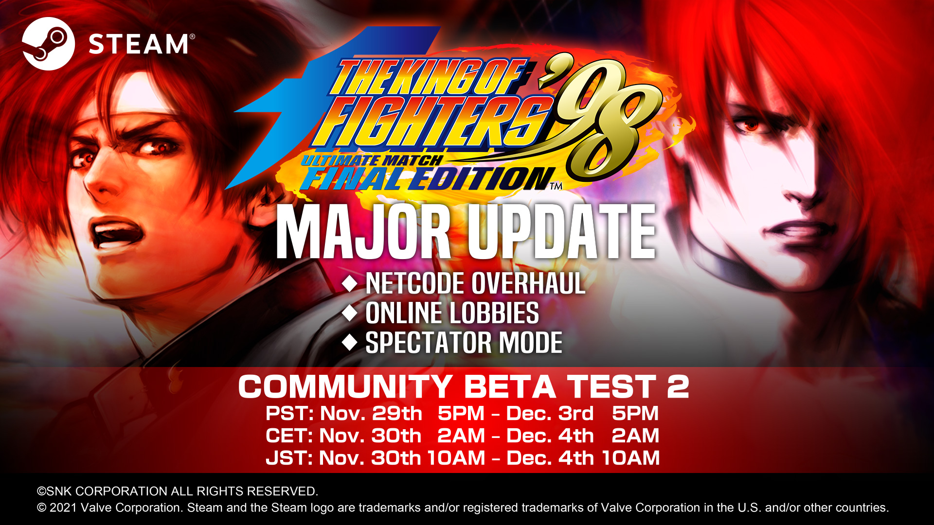 SNK CORPORATION anunció que THE KING OF FIGHTERS ’98, mejorará aún más. THE KING OF FIGHTERS ’98 ULTIMATE MATCH FINAL EDITION recibirá una importante actualización via Steam este invierno, agregando las principales funciones en línea que la comunidad ha estado esperando. Los interesados podrán comprobar estas nuevas funciones en un periodo de pruebas de la comunidad entre el 29 de noviembre y el 3 de diciembre.